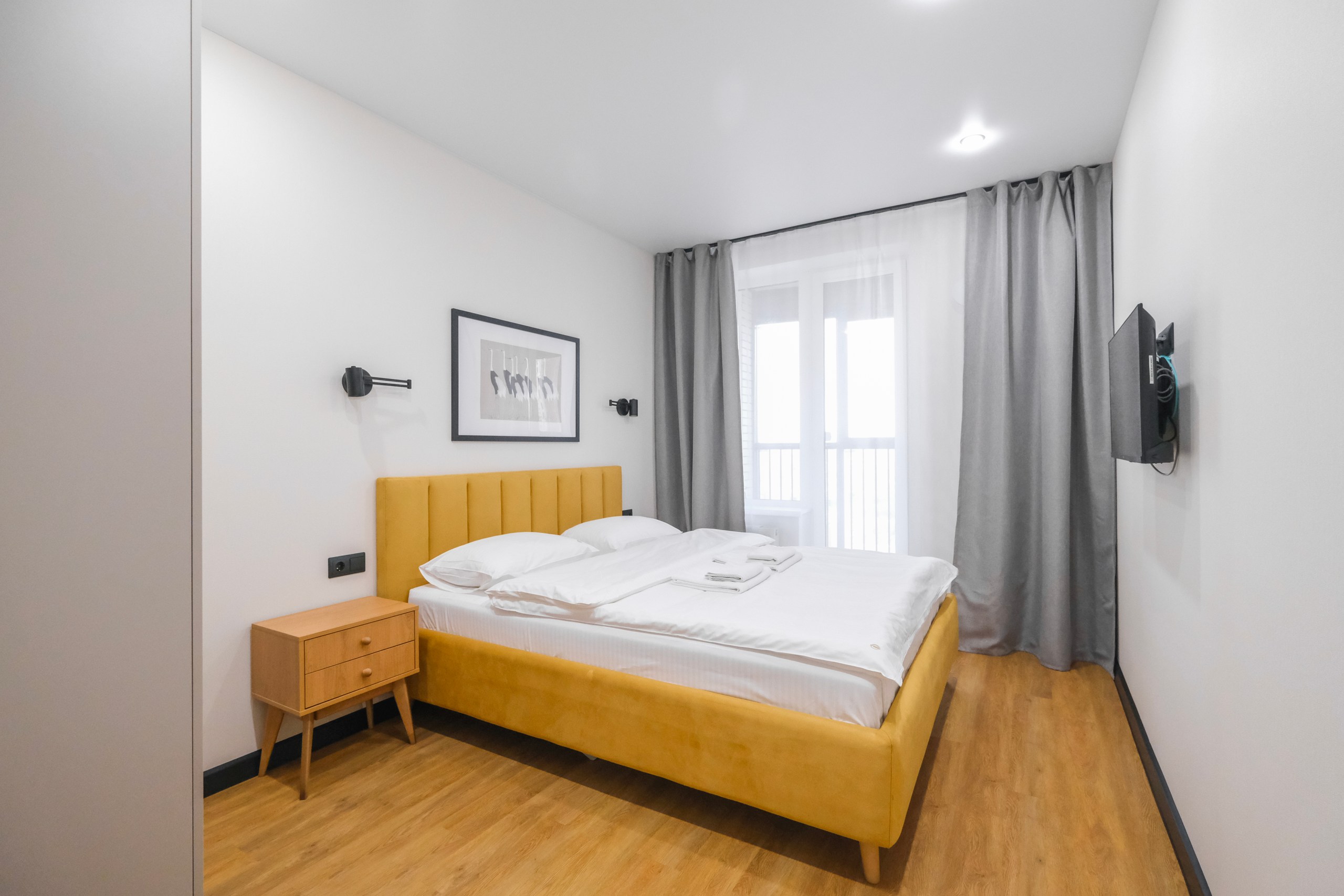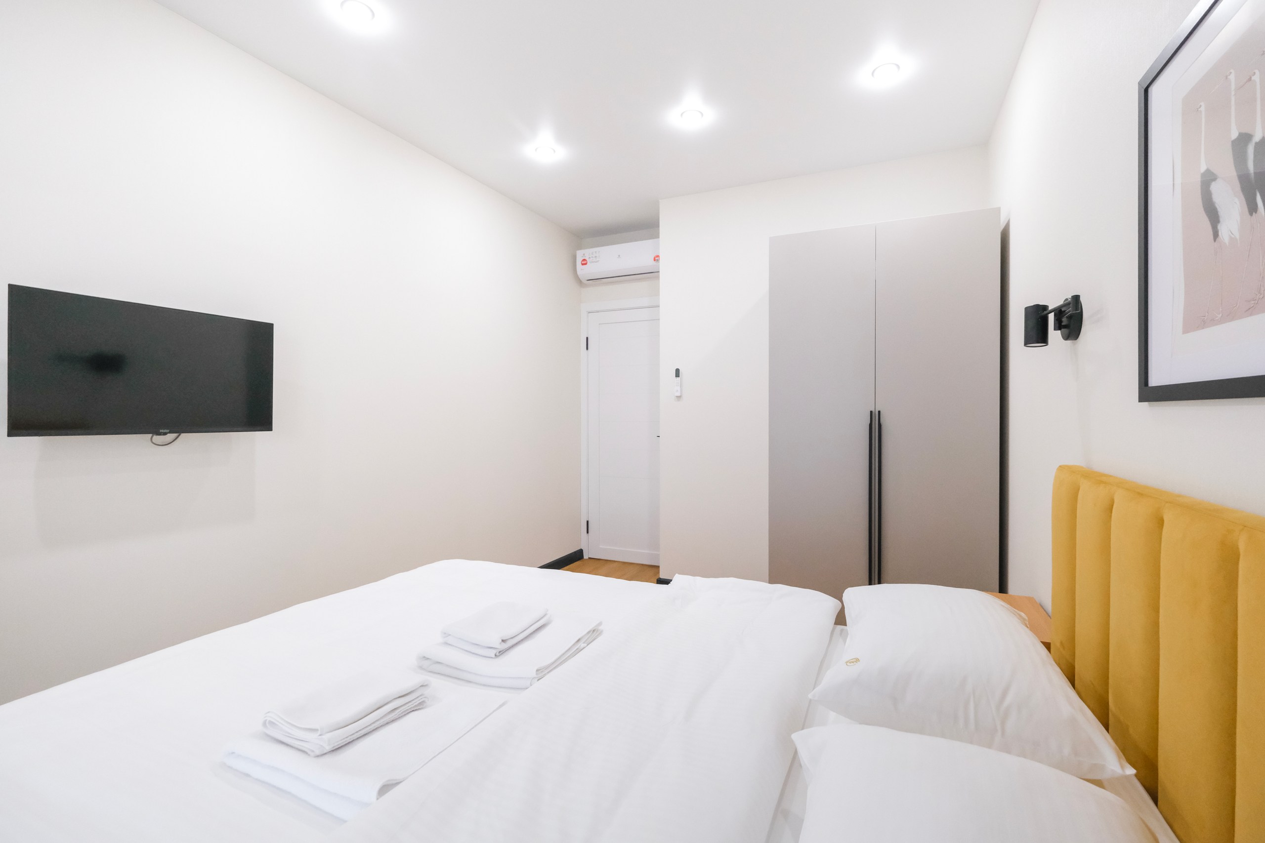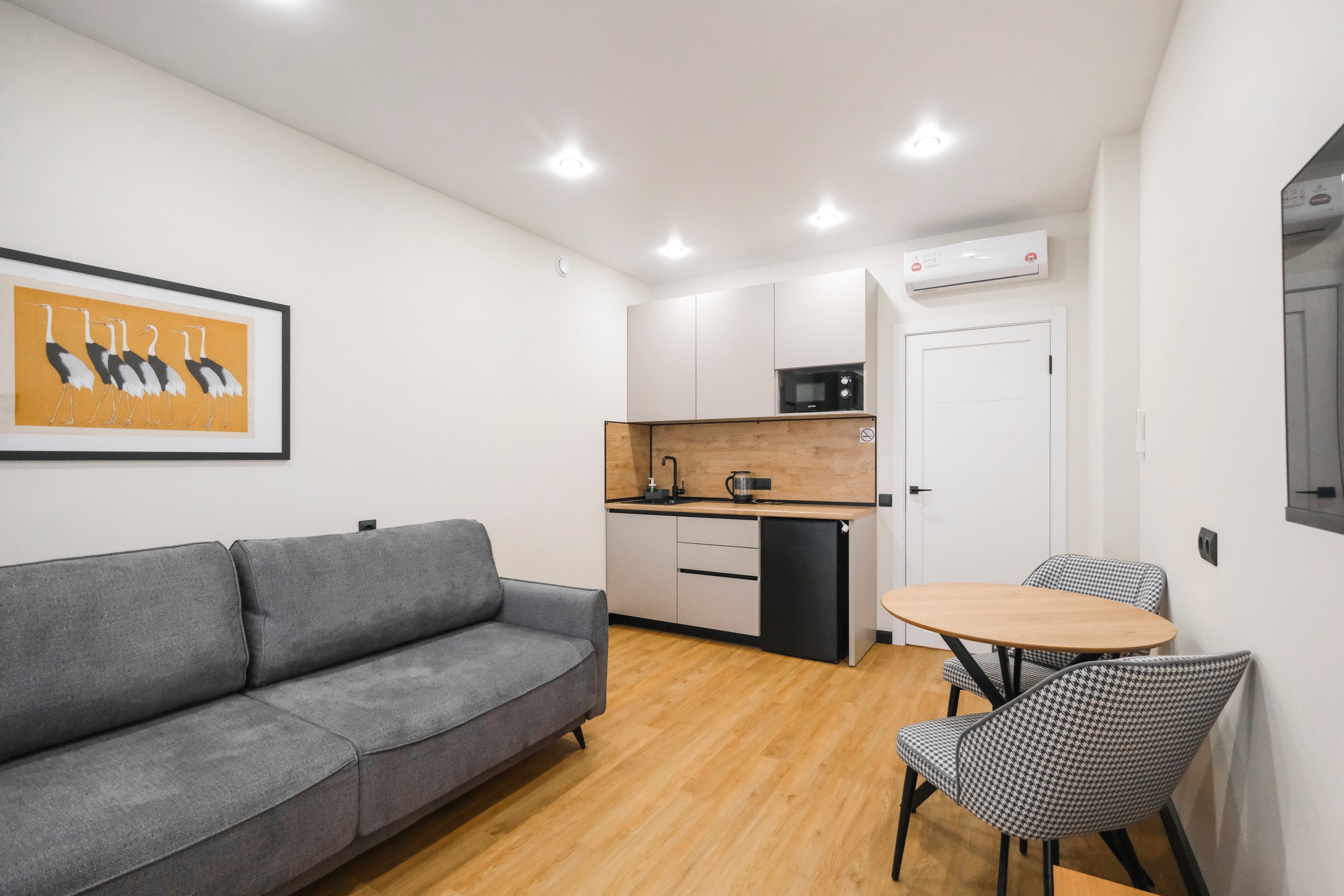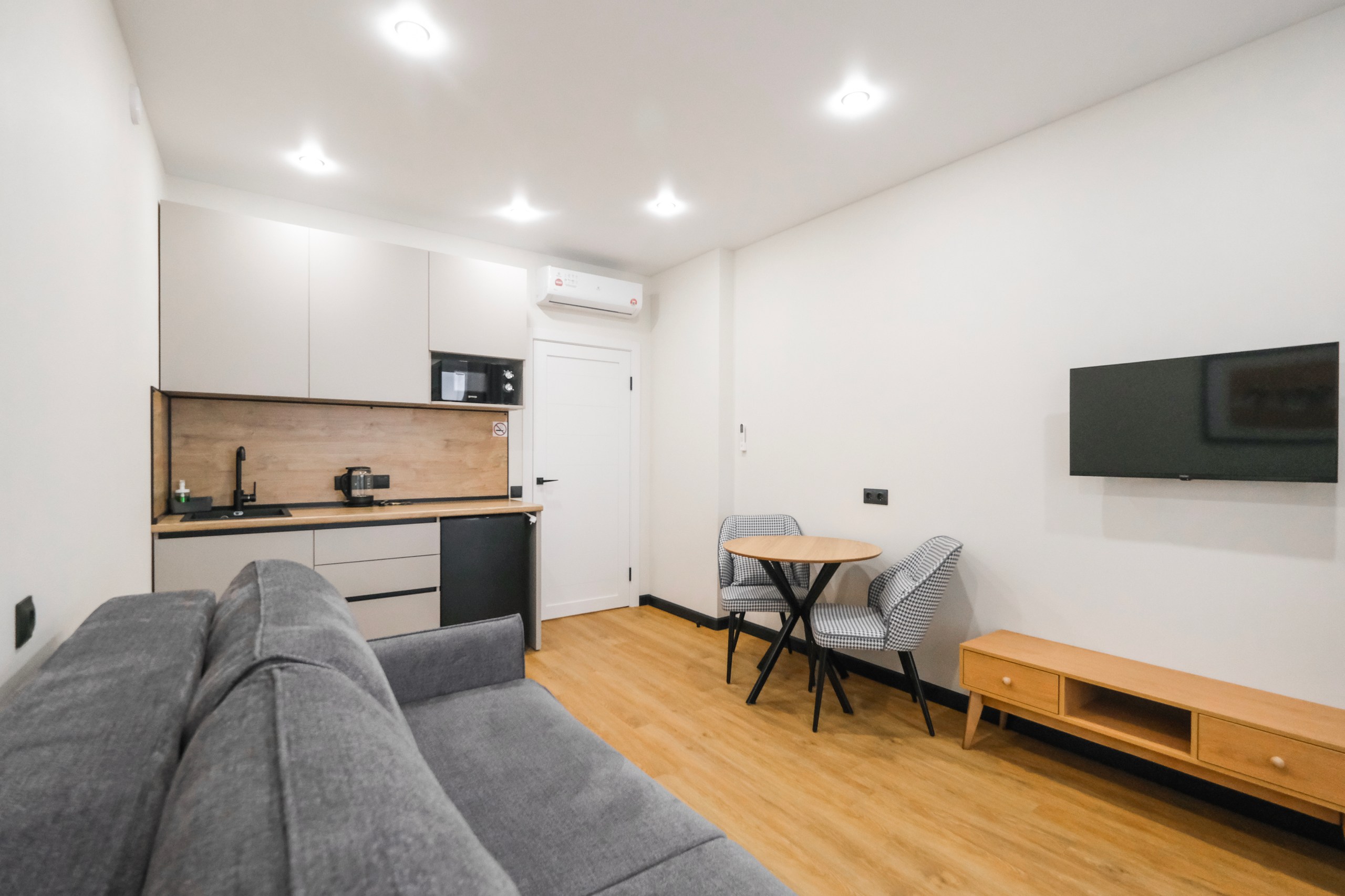 Wi-Fi • Кондиционер • Двухспальная кровать 160x200 • Фен • Утюг • Парковка • Встроенная кухонная мебель • Электрическая плита • СВЧ-печь • Электрочайник • Холодильник • Посуда • Гладильная доска • Обогреватель • Водонагреватель • Ванна • Стиральная машина • Смарт ТВ