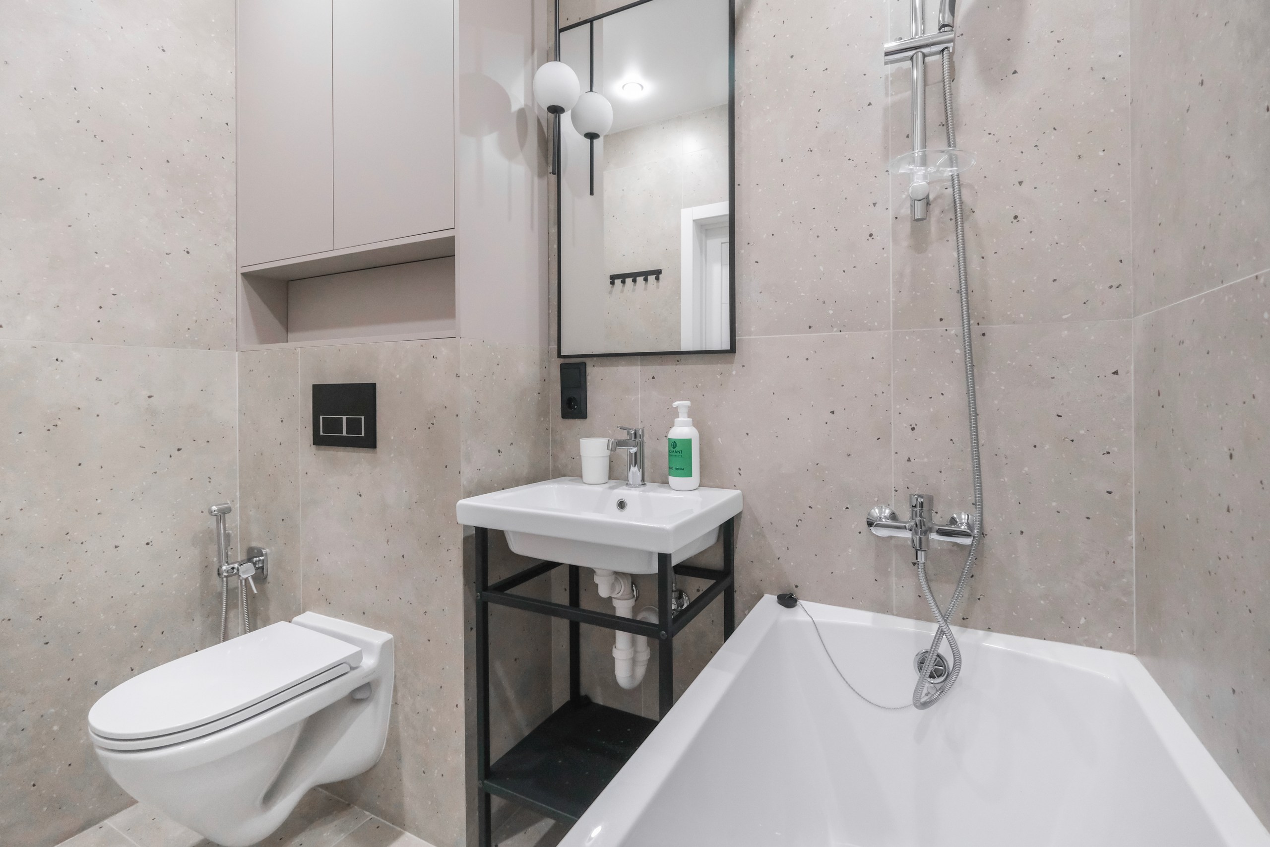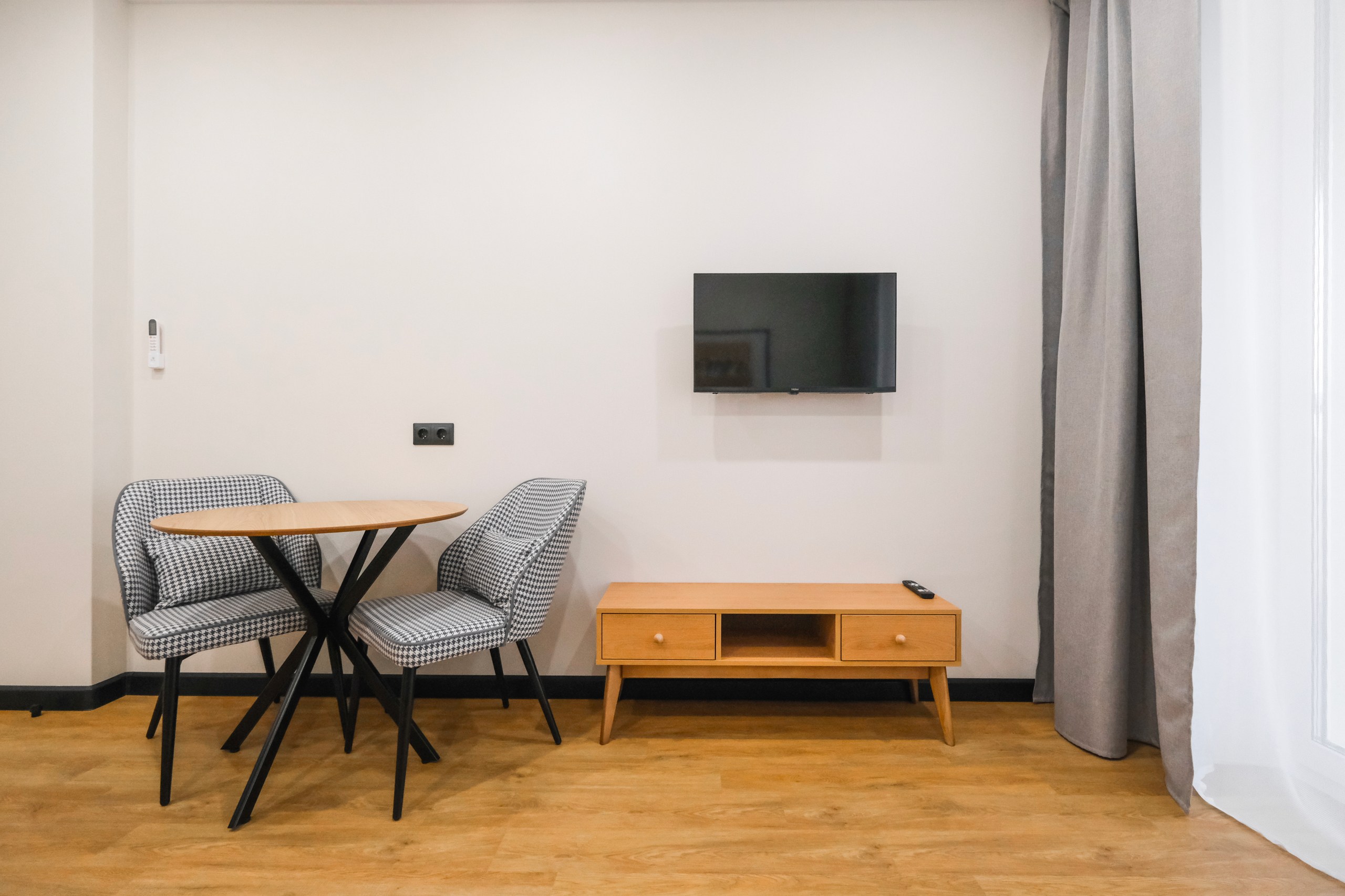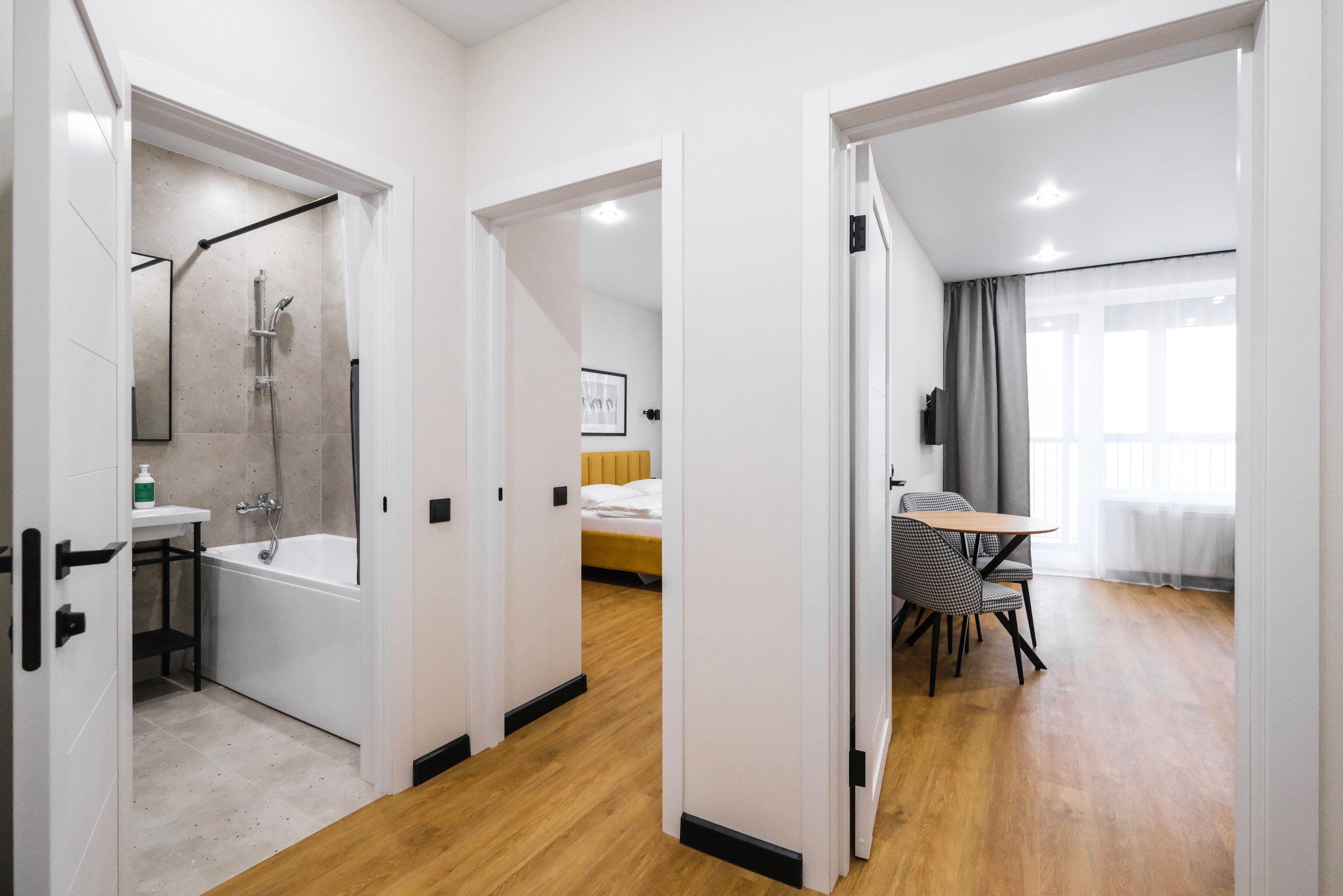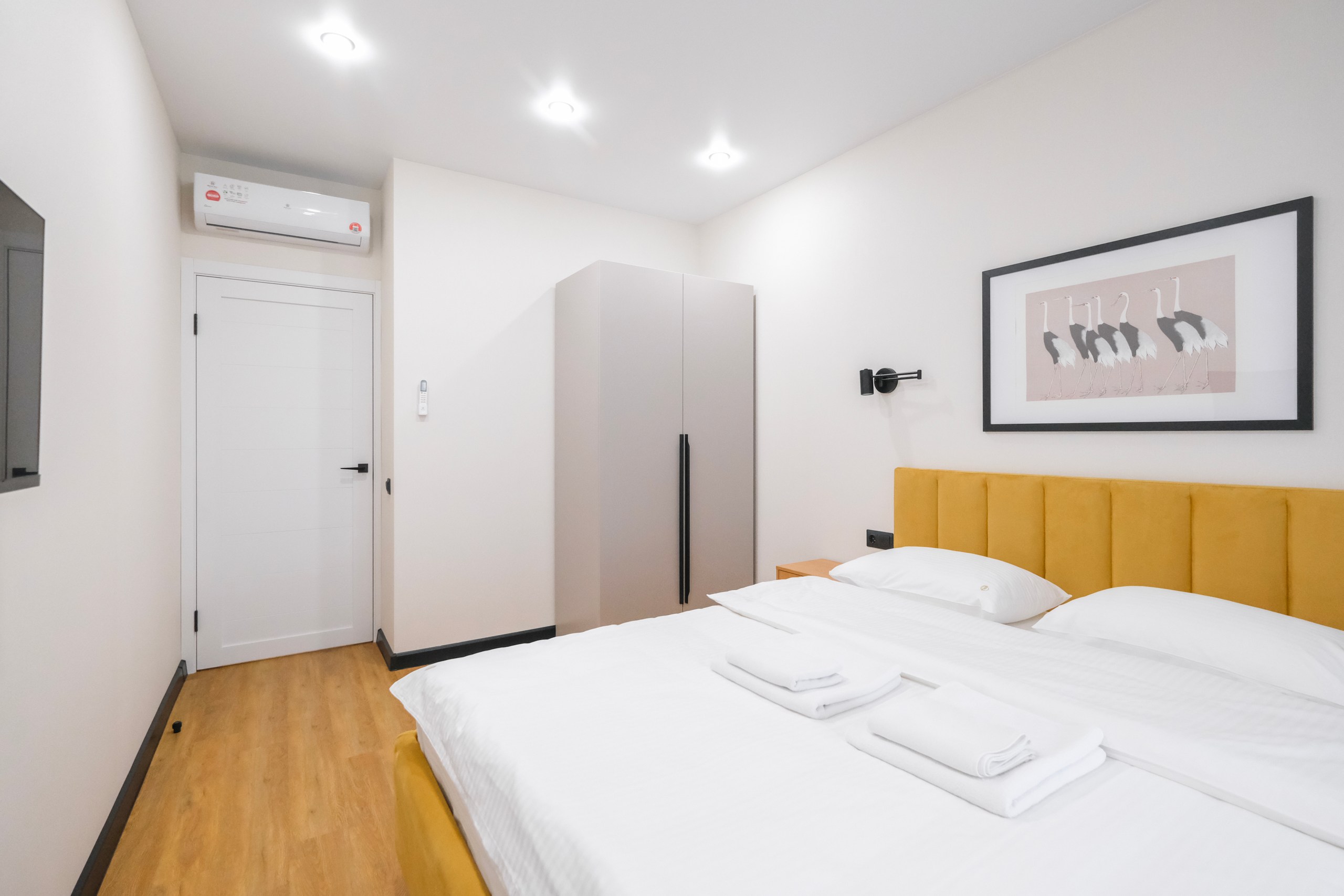Wi-Fi • Кондиционер • Двухспальная кровать 160x200 • Фен • Утюг • Парковка • Встроенная кухонная мебель • Электрическая плита • СВЧ-печь • Электрочайник • Холодильник • Посуда • Гладильная доска • Обогреватель • Водонагреватель • Ванна • Стиральная машина • Смарт ТВ