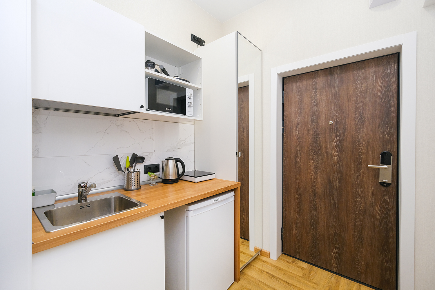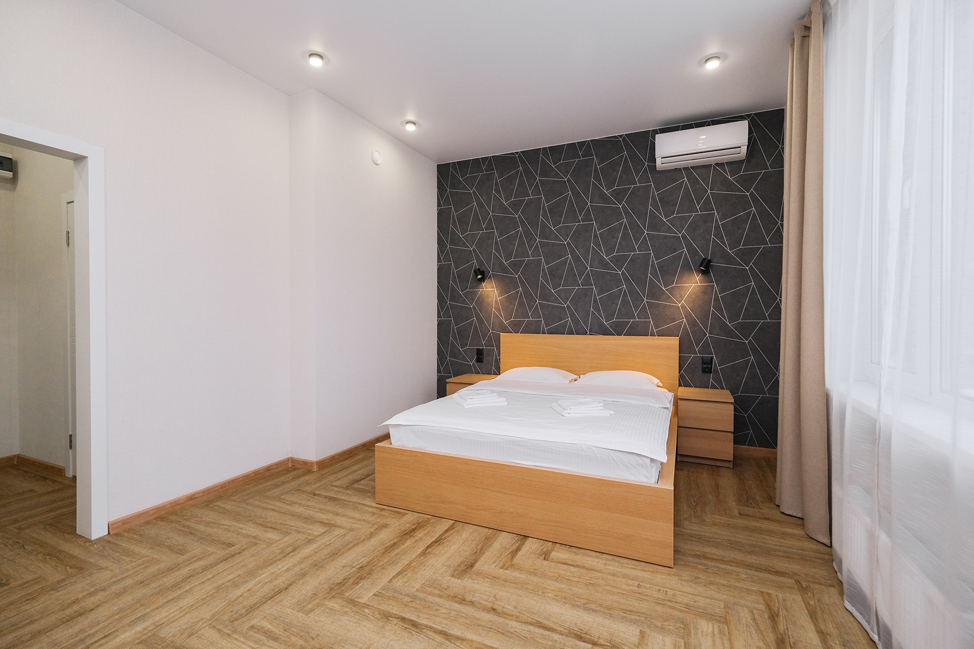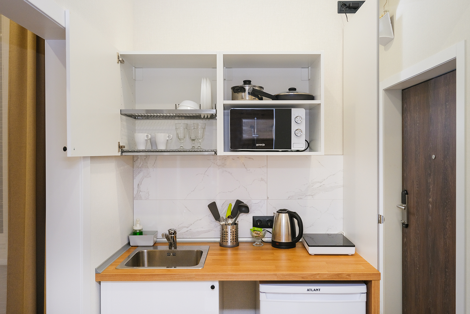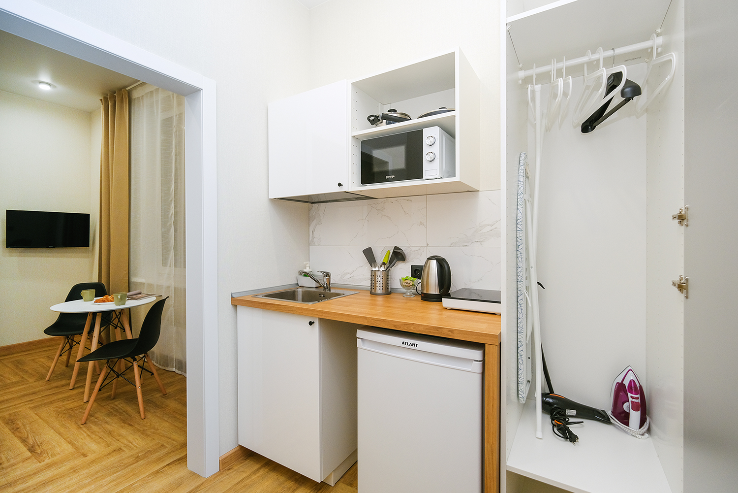 Wi-Fi • Кондиционер • Двухспальная кровать 160x200 • Фен • Утюг • Парковка • Встроенная кухонная мебель • Электрическая плита • СВЧ-печь • Электрочайник