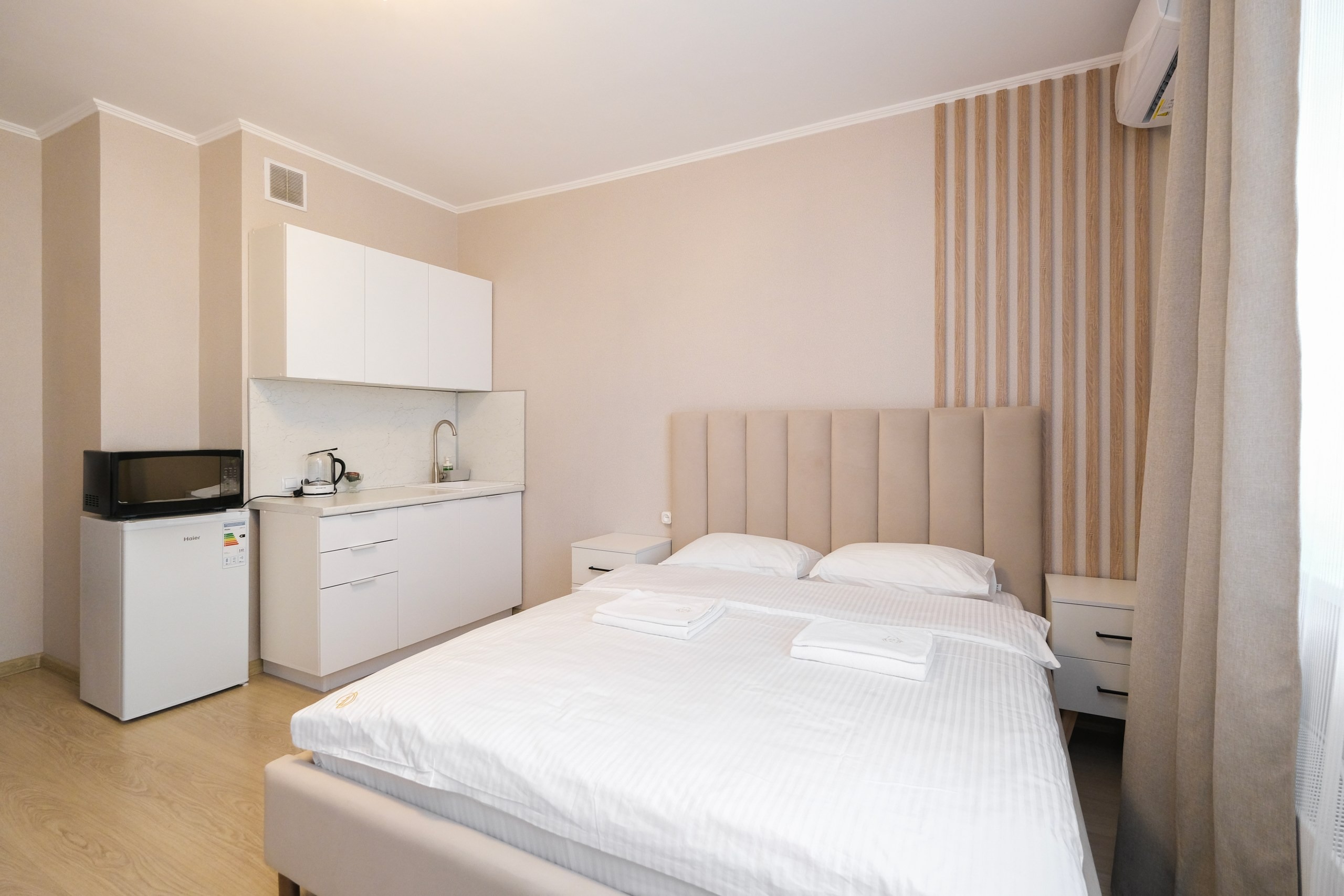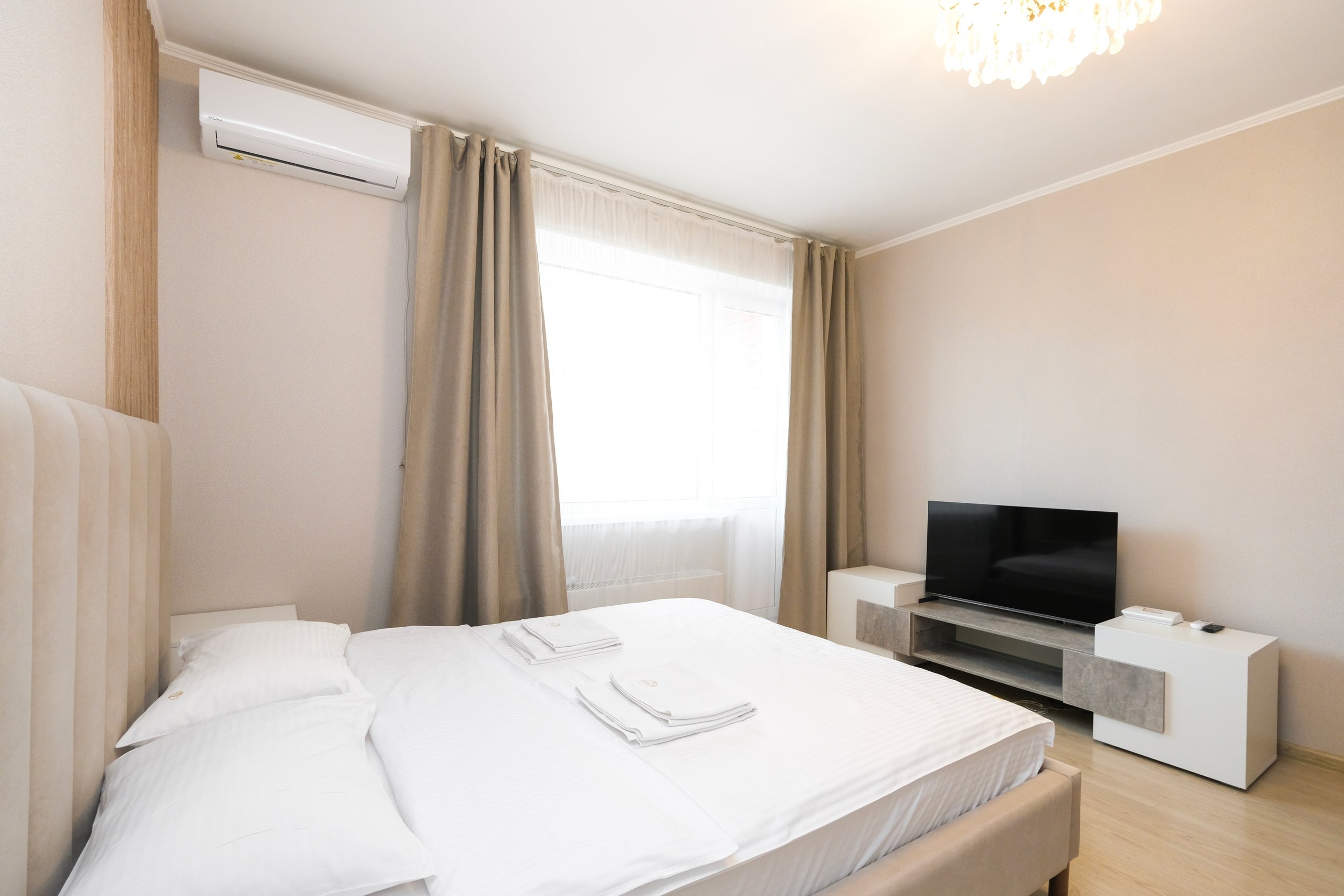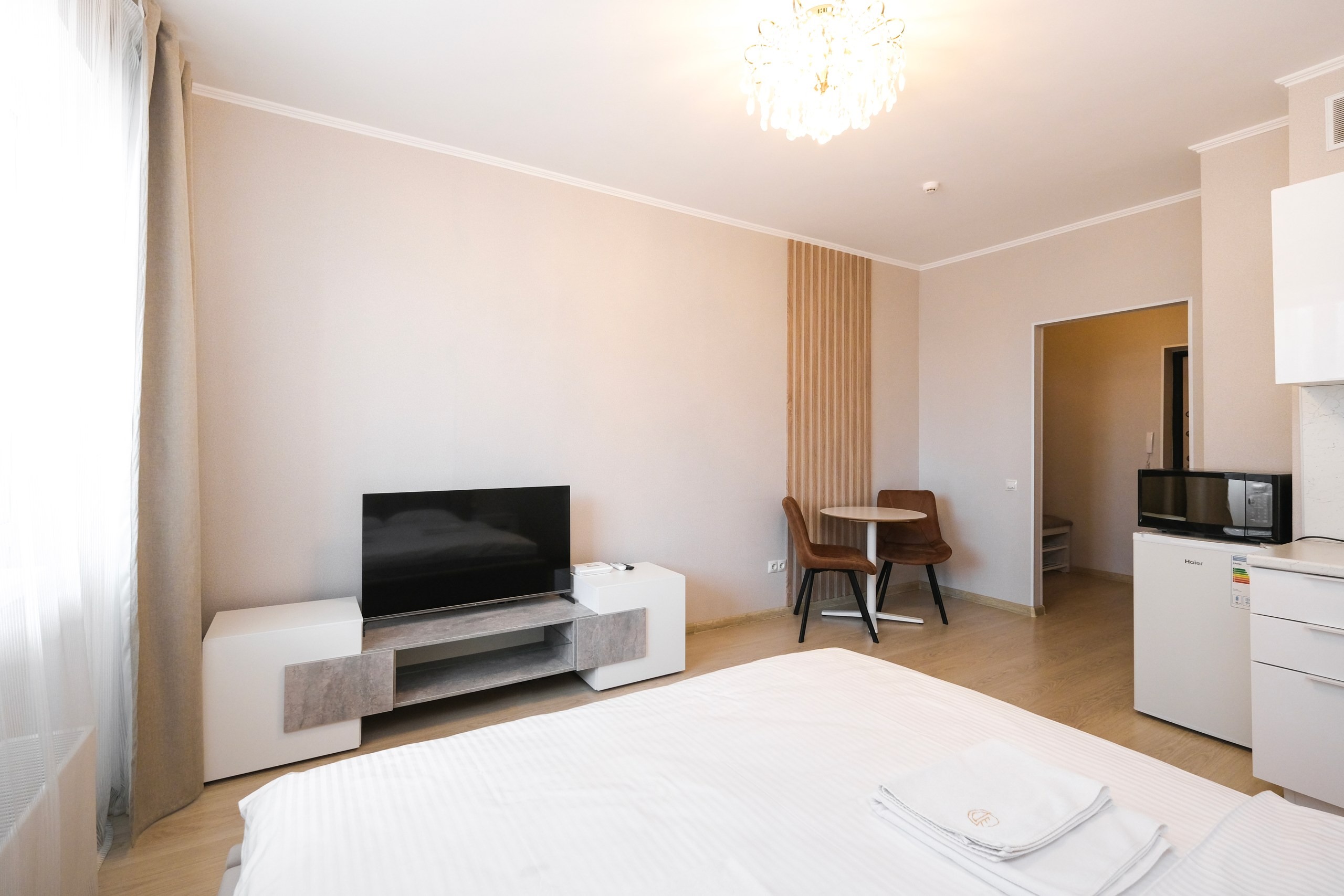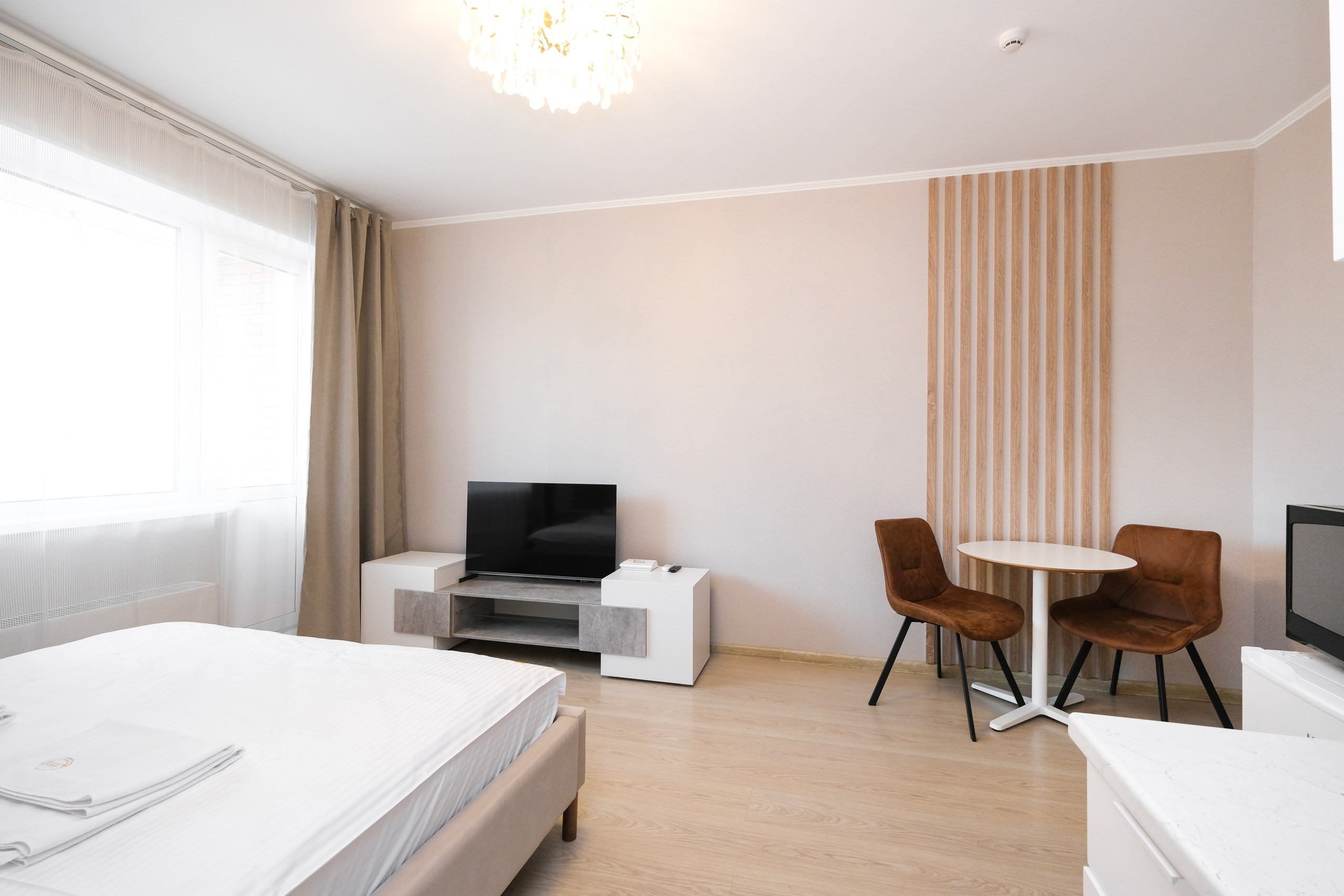 Wi-Fi • Кондиционер • Двухспальная кровать 160x200 • Фен • Утюг • Парковка • Встроенная кухонная мебель • Электрическая плита • СВЧ-печь • Электрочайник • Холодильник • Посуда • Гладильная доска • Обогреватель • Водонагреватель • Ванна • Стиральная машина • Смарт ТВ