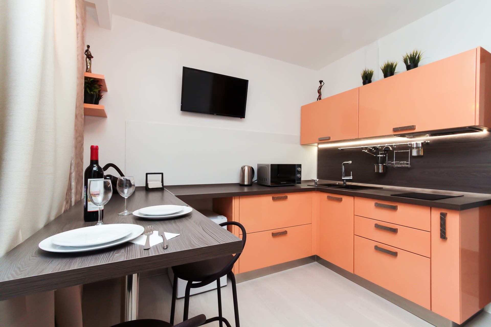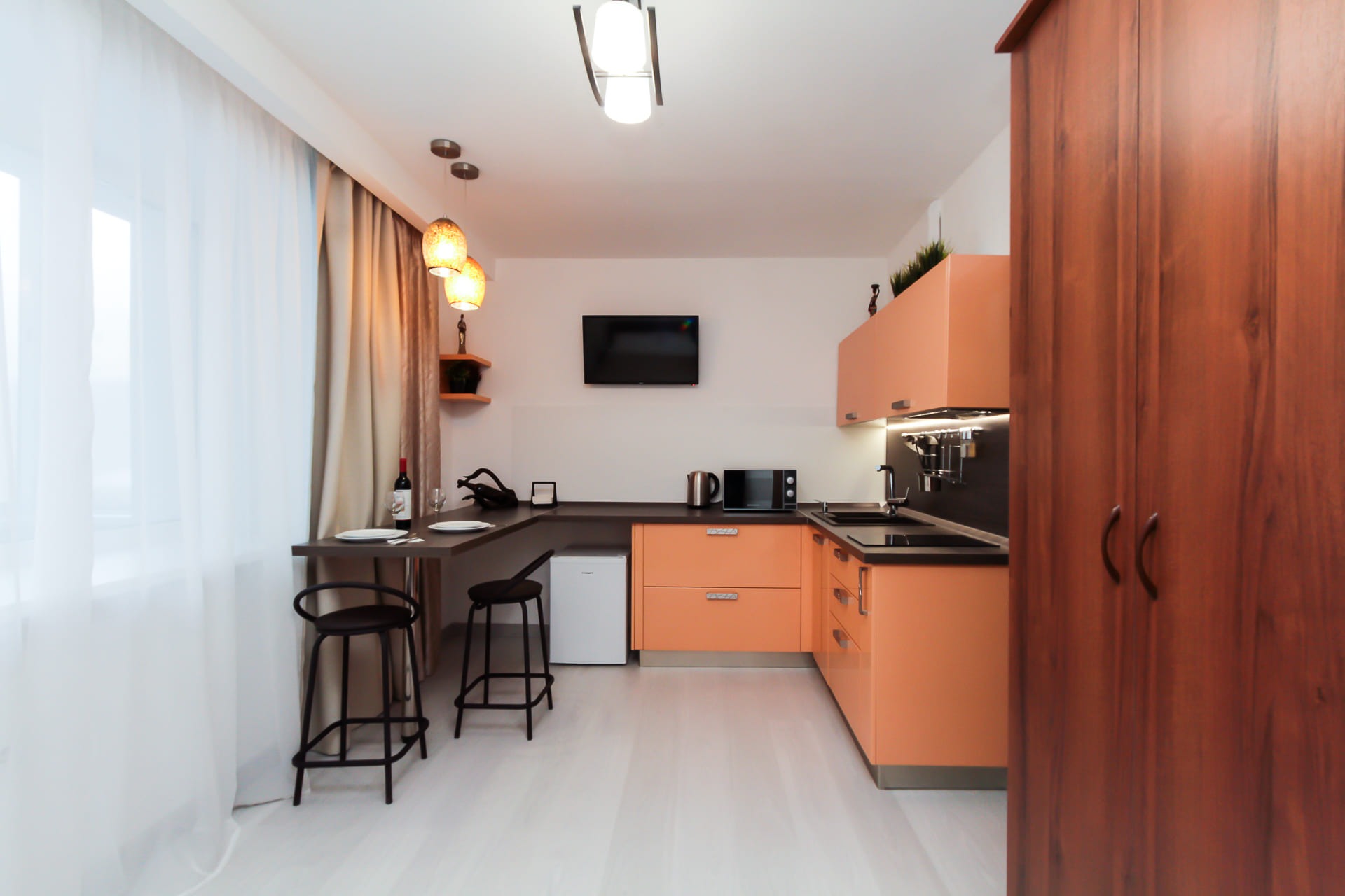 Wi-Fi • Кондиционер • Двухспальная кровать 140x200 • Фен • Утюг • Парковка • Встроенная кухонная мебель • Электрическая плита • СВЧ-печь • Электрочайник • Холодильник • Посуда • Гладильная доска • Обогреватель • Водонагреватель • Ванна • Стиральная машина • Кабельное TV • Смарт ТВ