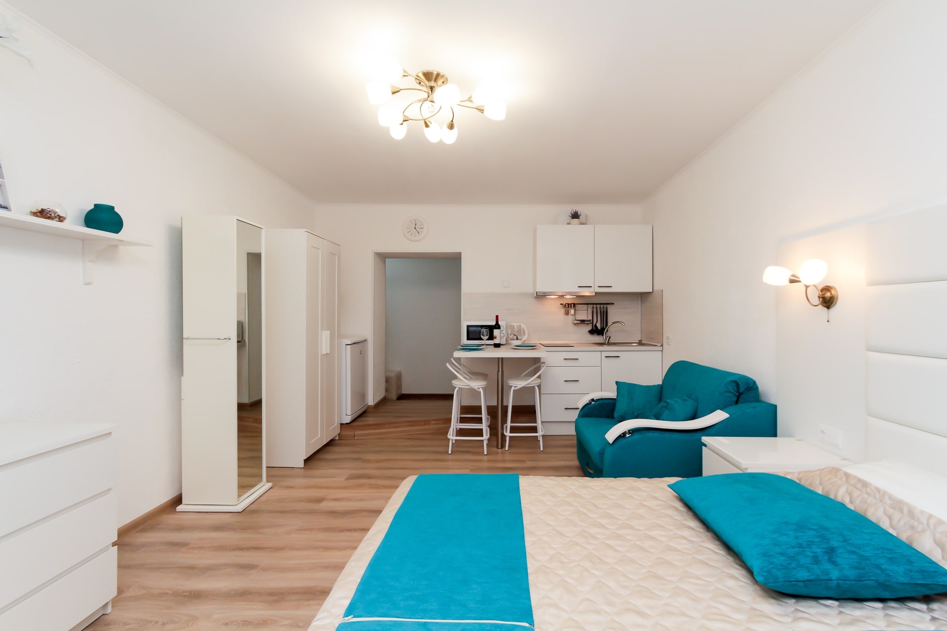 Wi-Fi • Кондиционер • Двухспальная кровать 160x200 • Фен • Утюг • Парковка • Встроенная кухонная мебель • Электрическая плита • СВЧ-печь • Электрочайник • Холодильник • Посуда • Гладильная доска • Обогреватель • Водонагреватель • Ванна • Стиральная машина • Кабельное TV • Смарт ТВ