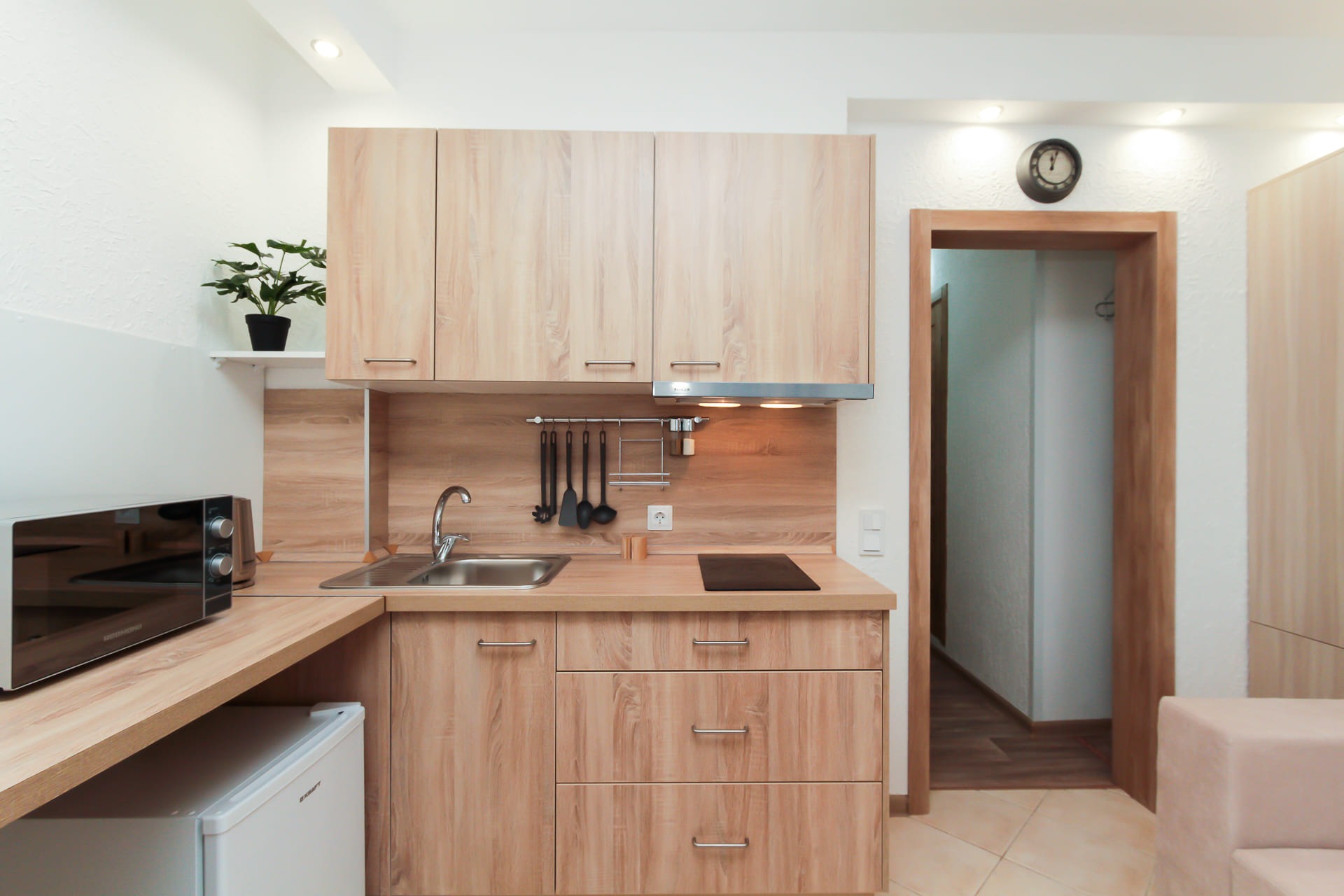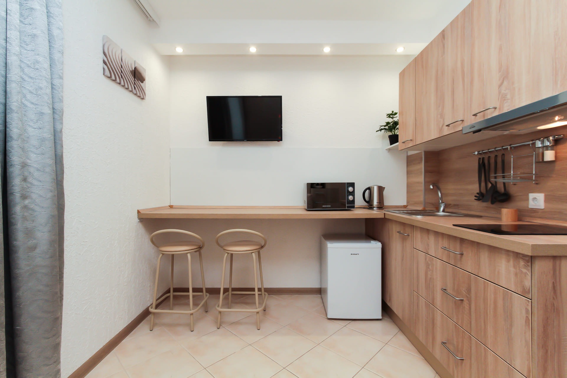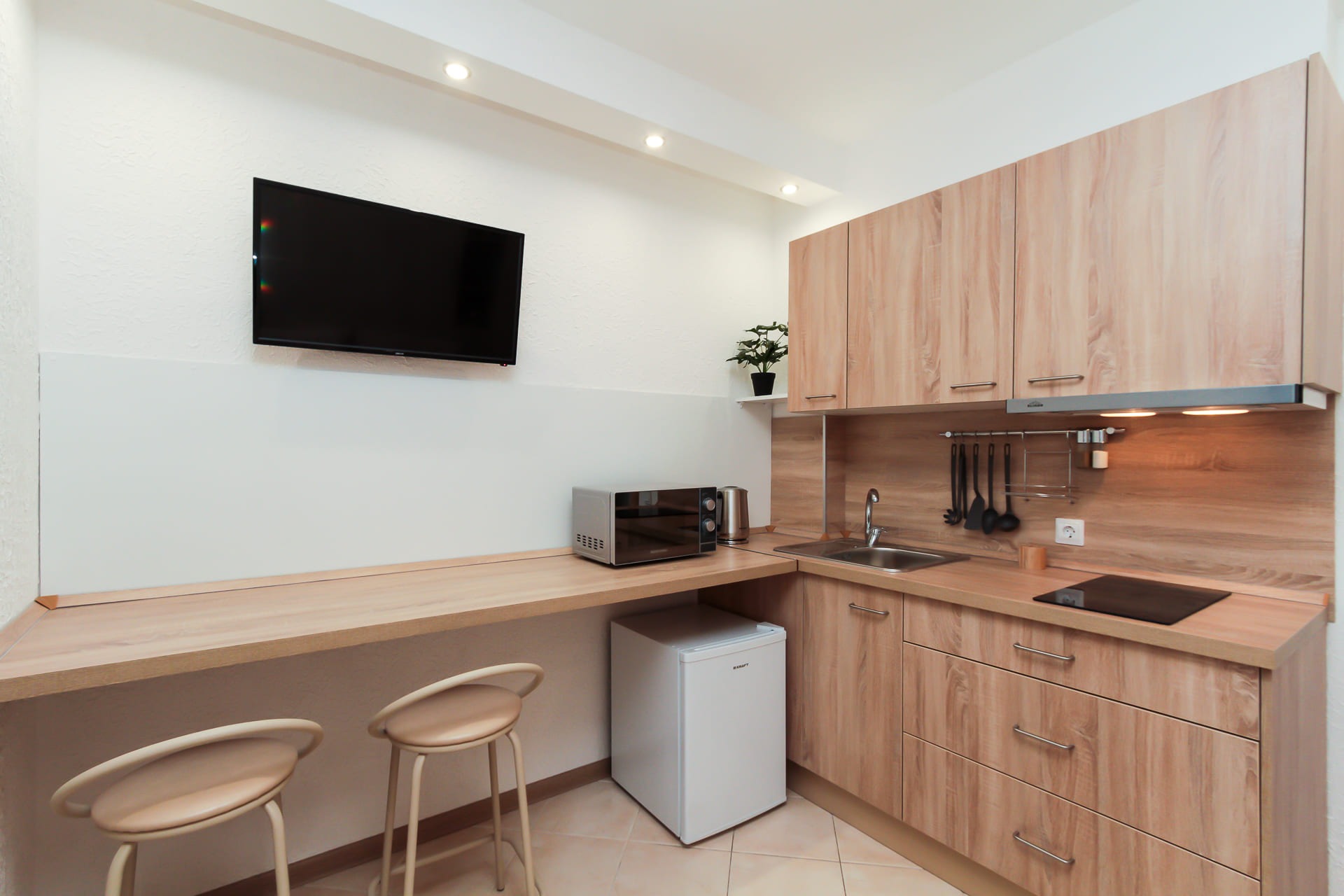 Wi-Fi • Кондиционер • Двухспальная кровать 140x200 • Фен • Утюг • Парковка • Встроенная кухонная мебель • Электрическая плита • СВЧ-печь • Электрочайник • Холодильник • Посуда • Гладильная доска • Обогреватель • Водонагреватель • Ванна • Стиральная машина • Кабельное TV • Смарт ТВ